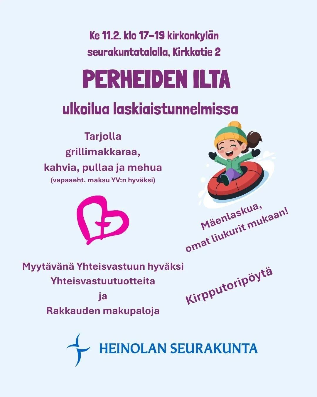 Yhteinen ilta ulkona! Luvassa on iloista yhdessäoloa, mäenlaskua ja talvista tekemistä lasten ja aikuisten iloksi. Illan aikana on tarjolla grillimakkaraa, kahvia, pullaa ja mehua. Paikan päällä on…