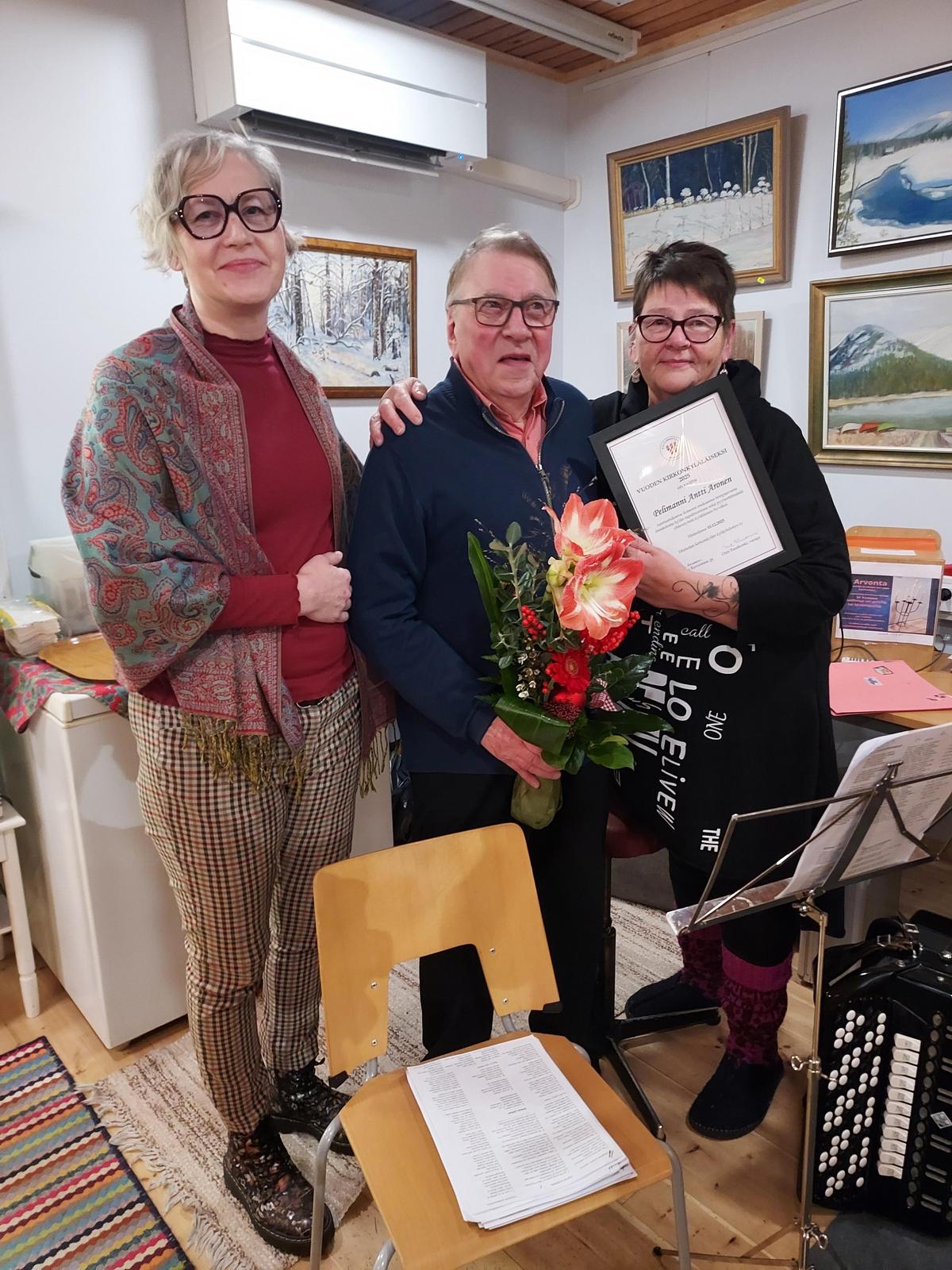 Keskiviikkoinen Kyläpirtin lauluilta alkoi halauksin ja ilontäyteisin tunnelmin, kun kyläyhdistyksen edustajat yllättivät ja luovuttivat vuoden 2025 kirkonkyläläinen -tunnustuksen saajalleen.